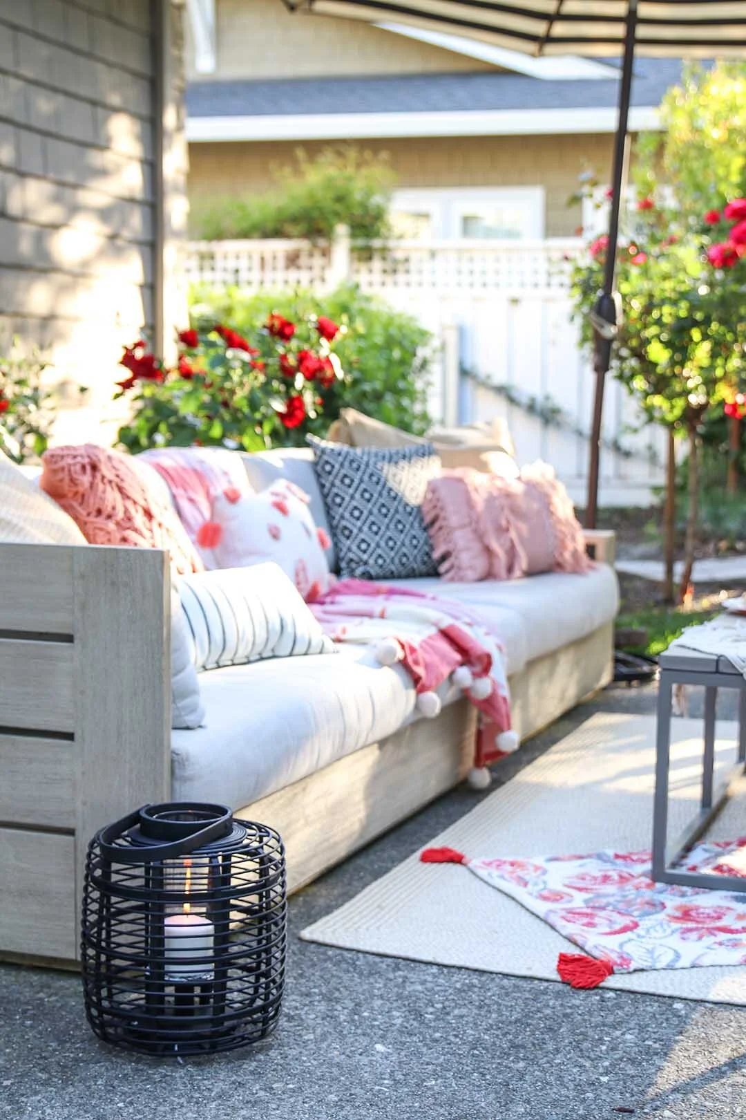 Another of my favorites spaces is the outdoor patio space. Throw pillows, decorative rugs, balloons, and candles are a great way to create a loving ambiance. I also love the front door decor added to the amazing light blue unique door. Very inexpensive ways to change the mood for a day or a couple of hours.